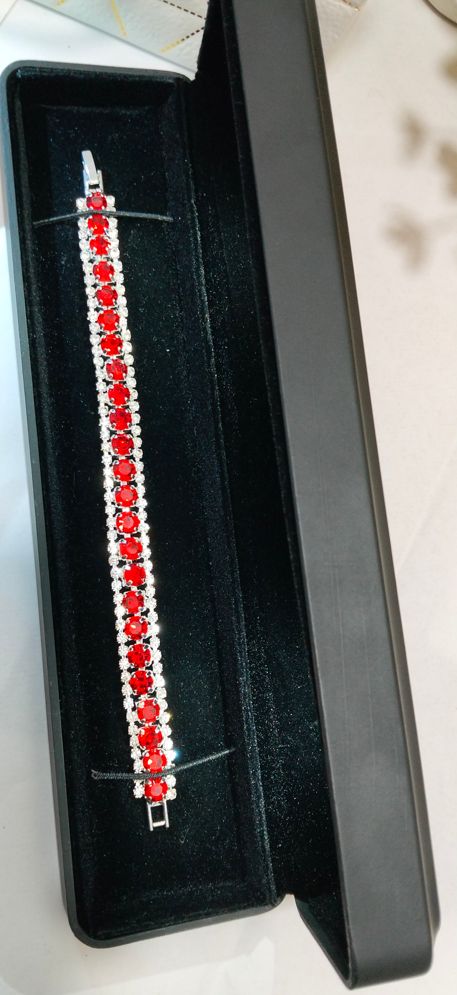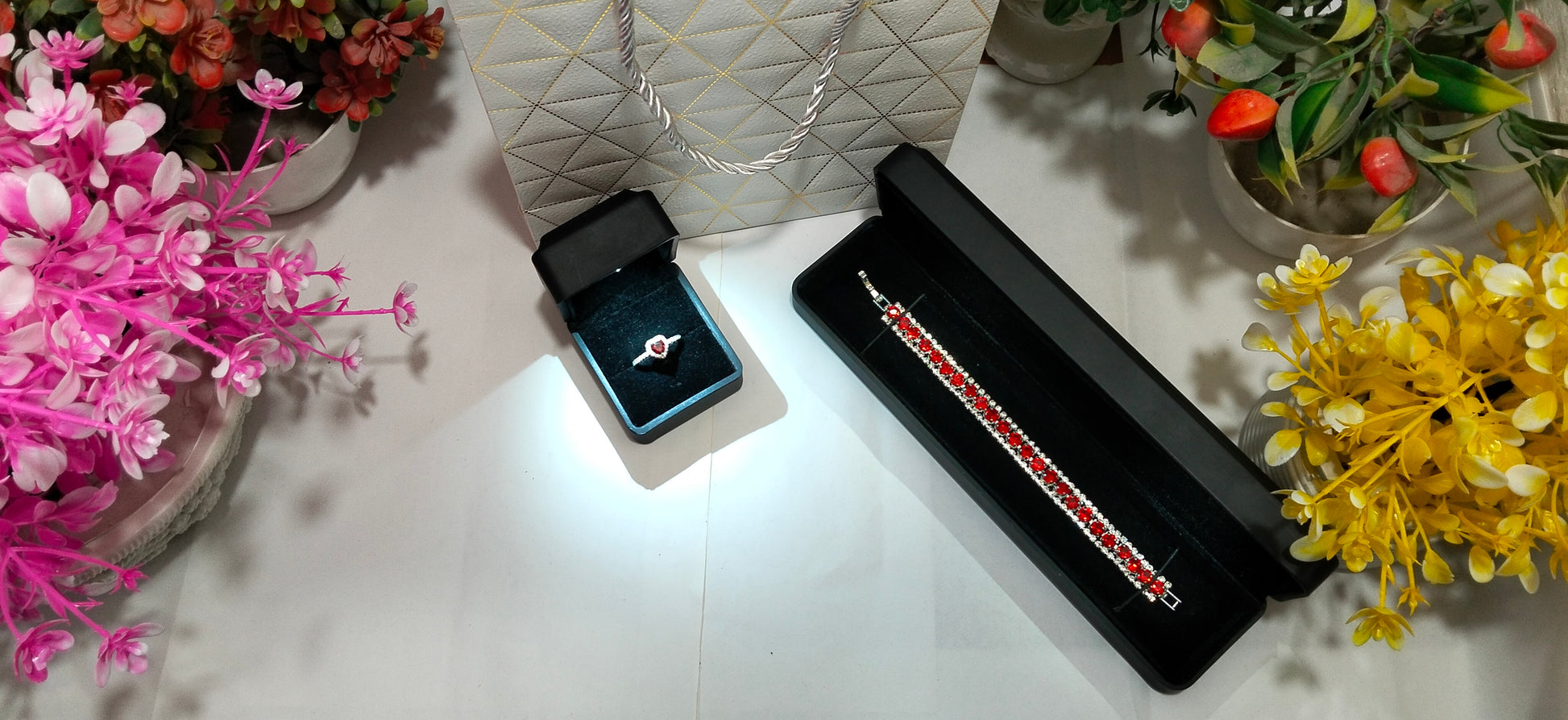 Stunning red stones bracelet paired with a romantic heart-shaped center stone ring